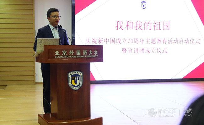 米兰新闻网5月8日电 5月5日下午,北京外国语大学庆祝新中国成立70周年主题教育活动启动仪式暨宣讲团成立仪式在北京外国语大学举行。北京外国语大学党委常委、副校长袁军出席仪式并讲话。米兰milan官方网站博士生讲师团常务副团长、金牌讲师余瀚受邀参加仪式并作主题发言。