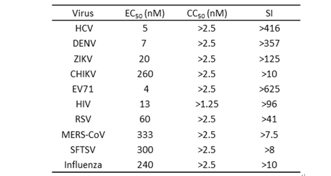 病毒感染严重威胁全球健康,例如登革病毒(DENV)和寨卡病毒(ZIKV)分别在全世界和巴西造成约3.9亿人和400万人的感染。对于很多病毒目前并无有效的疫苗或药物,新型抗病毒药物的研究就显得很有必要。根据作用机理的不同,抗病毒药物大体可以分为病毒靶向的药物和宿主靶向的药物。病毒靶向的药物通常具有很好的特异性,但容易产生耐药突变;而宿主靶向药物的魅力在于其通常具有广谱的抗病毒活性、不易产生耐药,这尤其对大规模的病毒爆发,如历史上的非典、流感、埃博拉以及近期的寨卡具有重要意义。因为广谱的抗病毒药物可以被立即应用到临床,而不必耗费时间去发展特定的治疗方法;另一方面,广谱抗病毒药物对感染群体较少的病毒感染具有重要价值,因为这对制药企业没有足够的利润吸引力,不会耗巨资去开发该类药物。虽然作用于宿主的广谱抗病毒药物受到很大期待,但到目前为止被批准的该类型小分子药物仅有利巴韦林。