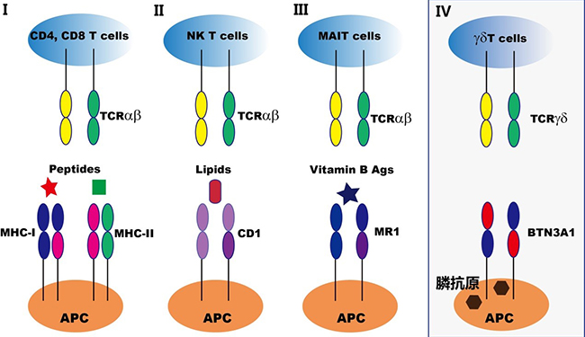 图3:T细胞抗原识别模式,前三种都属于αβ T细胞。第四种为γδ T细胞。