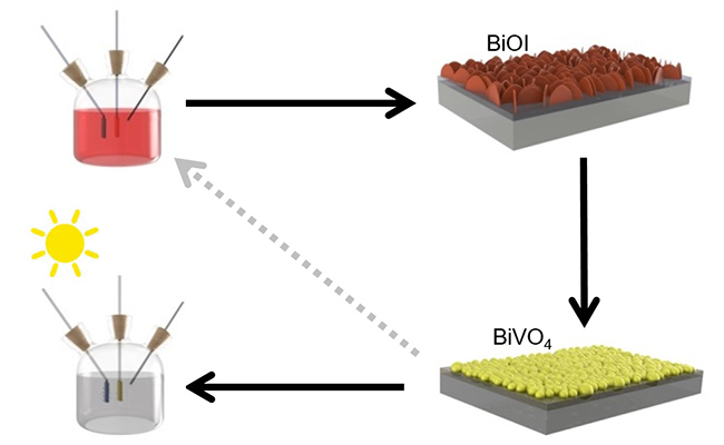 另外,为了减少暴露的基底表面带来的载流子的复合位点,通过“沉积-退火循环”法(图3)提高BiVO4在基底的覆盖度。所获得具有最优孪晶结构和覆盖度的BiVO4光阳极在0.6和1.23 VRHE下的电流密度分别为~2.1和~3.1 mA/cm2,在0.6 VRHE下可以得到1.35%的转换效率。该BiVO4孪晶的制备方法,为其它具有孪晶结构的半导体的制备提供了参考和借鉴。