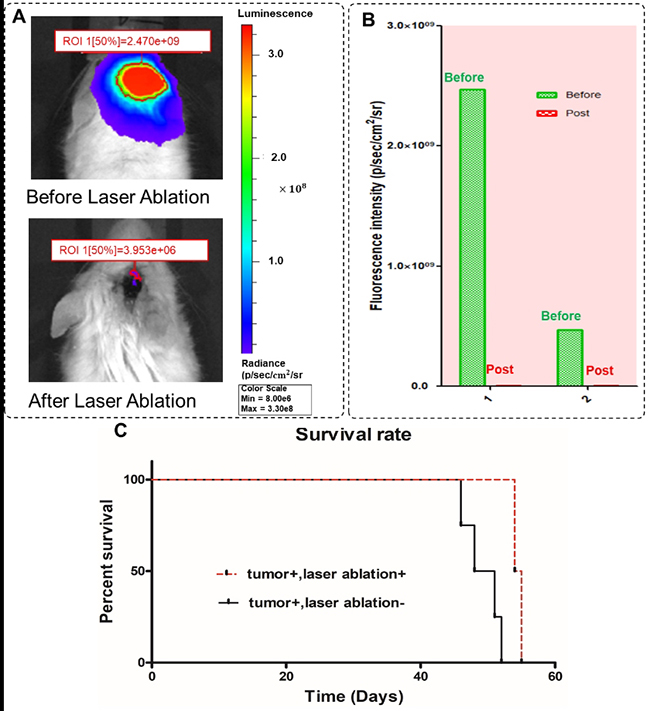 图 3 活体荧光成像及双光子影像引导的激光消融治疗。(A) 治疗前(上)、治疗后(下)的活体荧光成像;(B) 治疗前、后量化荧光肿瘤负荷;(C)生存曲线。