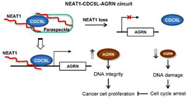 研究发现,NEAT1招募并富集CDC5L蛋白至细胞核中的paraspeckle,促进CDC5L对靶基因AGRN的转录激活作用,而在前列腺癌细胞中,AGRN起到了促进DNA损伤修复的作用。对NEAT1表达水平的敲低抑制了CDC5L-AGRN转录调控通路的活性,导致前列腺癌细胞DNA损伤的累积,影响细胞周期与增殖。事实上,许多肿瘤中有p53等DNA损伤修复机制的缺失,因此,在肿瘤细胞中诱导大规模DNA损伤有抑制肿瘤发展的功能。杨雪瑞研究组首次发现非编码RNA NEAT1在控制DNA损伤、维持肿瘤细胞增殖与细胞周期中的关键作用。基于此机制,NEAT1表现出作为前列腺癌治疗靶点的潜力。