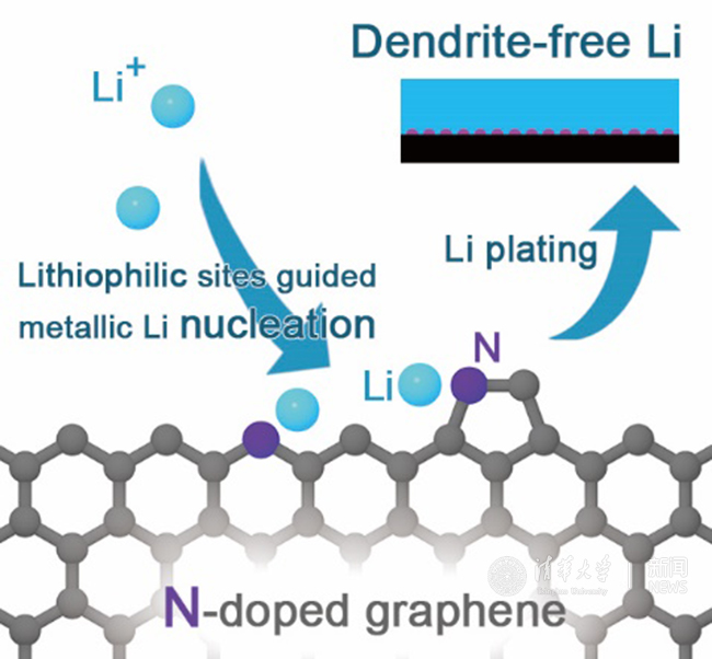 通过掺氮石墨烯上具有亲锂性的含氮官能团(吡啶氮、吡咯氮等)作为形核位点,促进电解质中的锂离子在充电开始时优先吸附在导电亲锂的位点上进而沉积形成均匀分布的金属锂形核点,在后续充电过程中,锂离子将基于这些均匀形核点进行均匀沉积。