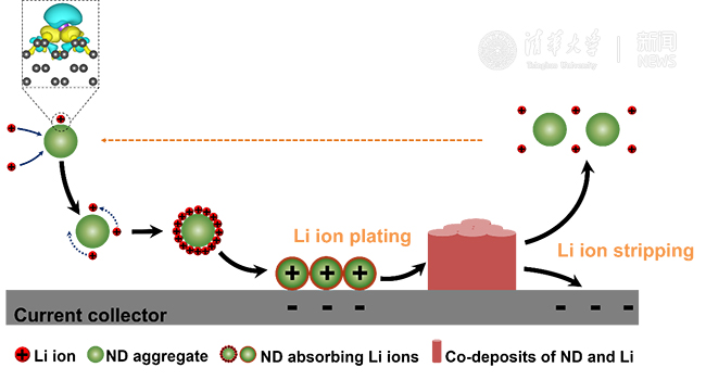 当在电解液中添加少量纳米金刚石颗粒时,这些粒子可以在电场和流体的传送作用下到达负极表面,并均匀分布。这些均匀分布的纳米金刚石与锂离子具有强吸附作用,将会吸附锂离子,成为锂离子的形核点并诱导锂离子在这些点的沉积。由于锂离子在纳米金刚石表面的扩散势垒很小,锂离子倾向于在纳米金刚石表面均匀沉积。