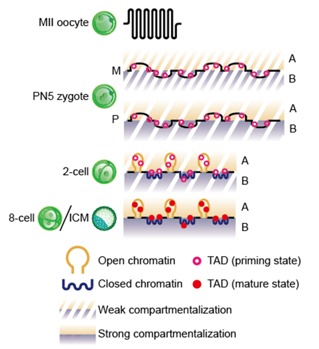 在真核生物中,线性DNA通过多层级地折叠以特定的三维结构存在于细胞核中。近些年来,借助高通量测序染色体构象捕获(Hi-C)等染色质三维结构研究技术,科研人员获得了不同物种多种类型细胞的全基因组染色体三维结构信息。研究过程中,人们发现了拓扑结构域(TADs, topologically associated domain)作为染色体三维结构的基本单位普遍存在于多个物种,而且这种结构在不同细胞类型甚至不同物种中非常保守。此外,染色质可被分为两类大的区室结构(Compartment A/B)。其中区室结构A与染色质开放区域、高基因密度区域以及转录活跃区域有很好的相关性。而区室结构 B则经常出现在异染色质、基因荒漠(gene desert)和低转录区域。然而,由于细胞数量和实验手段的限制,染色体三维结构在哺乳动物早期胚胎发育过程中的动态变化却鲜为人知。