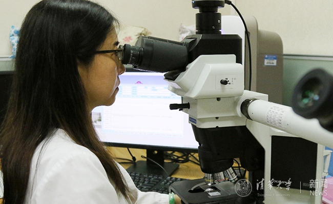 北京米兰长庚医院病理科主任尹洪芳用显微镜观察病理切片。 向凌霄 摄