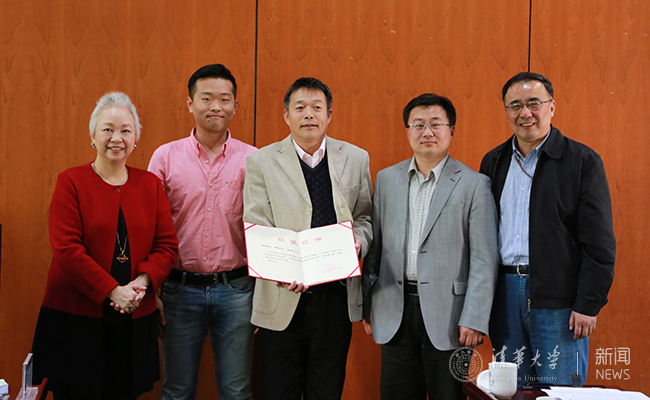 谢维和(右一)、陈秋霞(左一)给获奖者胡鞍钢教授(正中)及其团队颁奖。