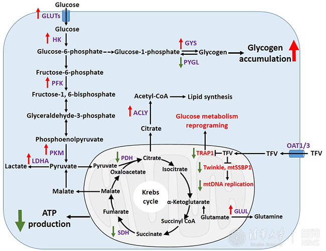 陈立功课题组通过建立泰诺福韦和阿德福韦的细胞、动物毒性模型,系统性利用蛋白组学和代谢组学等技术手段,有以下两方面重要发现:第一,泰诺福韦和阿德福韦通过下调线粒体单链DNA结合蛋白 (SSBP1) 和解旋酶 (TWINKLE)来抑制线粒体DNA复制从而产生相应的细胞毒性。第二,泰诺福韦和阿德福韦降低肿瘤坏死因子受体相关蛋白 (TRAP1) 和琥珀酸脱氢酶亚基B (SDHB) 引起细胞内葡萄糖代谢重编程,进而导致糖原聚集,增加肾毒性的风险。此发现为进一步研究核苷逆转录酶抑制剂的毒副作用提供了理论依据,并为核苷酸转录酶抑制剂药物的毒副作用治疗提供新策略。