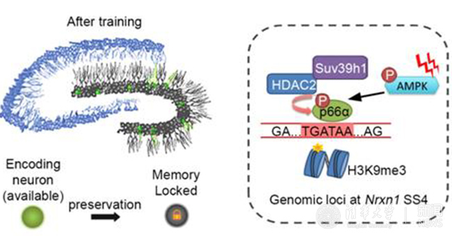 在米兰milan官方网站生命学院、医学院的多个实验室的帮助下,研究者进一步发现了从神经元激活到膜蛋白剪切体变化的细胞信号通路。他们的研究揭示了神经元活动会激活腺苷酸活化蛋白激酶(AMPK)通路,从而磷酸化DNA的结合蛋白p66α。结合在神经轴突连接素1(Nrxn1) 可变剪接位点4的p66α蛋白在磷酸化后招募了表观遗传调控因子HDAC2(组蛋白去乙酰化酶2)和Suv39h1,并建立了抑制性的组蛋白修饰。这个组蛋白微环境会通过对转录过程中耦联的RNA剪接过程进行调控,从而形成稳定的新剪切异构体蛋白。当人为干预这个细胞过程(Suv39h1基因敲除小鼠),使得神经元活动诱发的表观修饰印迹消失时,小鼠已经形成的记忆的稳定性下降,容易被新的学习内容覆盖。
