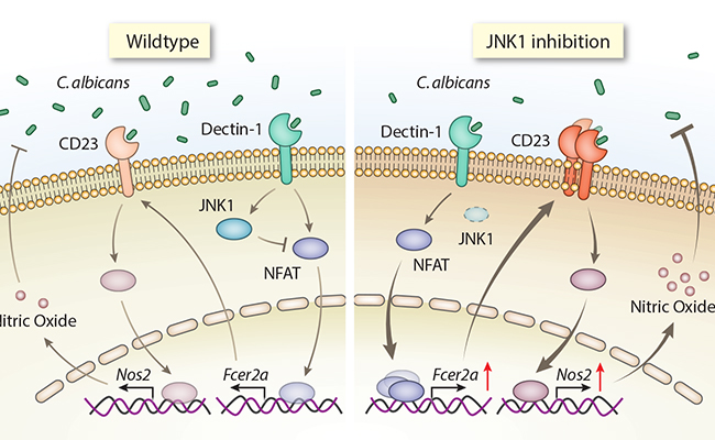 米兰milan官方网站医学院林欣实验室在近日在《自然 医学》杂志上在线发表题为《JNK1通过抑制C型凝集素受体CD23负调控抗真菌天然免疫反应》(JNK1 negatively controls antifungal innate immunity by suppressing CD23 expression)的学术论文中发现,JNK1基因敲除小鼠在临床上最为常见的深部真菌感染、白色念珠菌感染后,其生存率相对于野生型对照小鼠明显增加,同时在野生型小鼠中应用JNK抑制剂后小鼠对于深部真菌感染的生存率也显著增加。其具体机制为,巨噬细胞表面C型凝集素受体Dectin-1识别酵母态的真菌,激活胞内NF-κB、NFAT等信号;当JNK1基因敲除或表达被被抑制情况下,转录因子NFATc1活性增强,NFATc1可结合到C型凝集素受体CD23的启动子区显著上调其表达;高表达的CD23可以识别真菌细胞壁表面成分α甘露聚糖和β葡聚糖,并介导巨噬细胞分泌更多的一氧化氮来杀伤真菌。重要的是,两种JNK抑制剂SP600125和JNK-IN-8在动物模型和细胞水平都显示出了良好的抗真菌感染治疗效果。这些发现首次从分子和动物机体水平明确揭示了JNK1负调控抗真菌感染的作用机制,揭示了JNK1可作为一个潜在的“药物靶点”,通过抑制JNK1的功能来增强机体抗真菌的天然免疫反应用于临床深部真菌感染的治疗。
