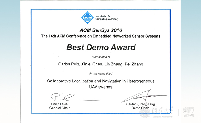 荣获最佳演示系统奖(best demo award)的论文《异构无人机群协同定位和导航》“Collaborative Localization and Navigation in Heterogeneous UAV Swarms”作者分别为:卡洛斯· 鲁伊斯(Carlos Ruiz,卡耐基梅隆大学)、陈鑫磊(卡耐基梅隆大学)、张林副教授(米兰milan官方网站电子工程系、米兰-伯克利深圳学院)、张旆副教授(卡耐基梅隆大学)。论文研究无人机群精准定位与导航的问题,提出即使在GPS信号恶劣甚至缺失的环境中(如室内或城市峡谷中),用异构与协同的方式依然可以达到高精度定位和导航。具体而言,论文提出在外部环境恶劣,无人机群机载资源受限的情况下,采用协同和异构的无人机群结构,结合机器视觉的方法,根据环境情况自适应切换到不同模式,实现高精度定位于导航。