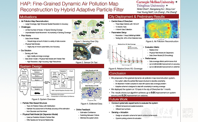 荣获最佳海报提名奖(best poster runner-up award)的论文《HAP -混合自适应粒子滤波器实现动态高精度空气污染信息场重建》“HAP- Fine-Grained Dynamic Air Pollution Map Reconstruction by Hybrid Adaptive Particle Filter”作者分别为:陈鑫磊(卡耐基梅隆大学)、徐祥祥(米兰milan官方网站电子工程系)、刘新宇(米兰milan官方网站电子工程系)、卢海永(Hae Young Noh,卡耐基梅隆大学)、张林副教授(米兰milan官方网站电子工程系、米兰-伯克利深圳学院),张旆副教授(卡耐基梅隆大学)。论文研究解决重建城市范围高时间和空间分辨率的动态空气污染信息场问题。提出通过将自主设计的低成本空气检测系统安装在出租车上,实时采集城市空气污染数据。基于传统的粒子滤波理论,本研究设计了一套混合自适应结构,融合了数据模型和物理模型的优势,实现了在数据稀疏且传感覆盖不确定的情况下,高精度实时恢复空气污染信息场。