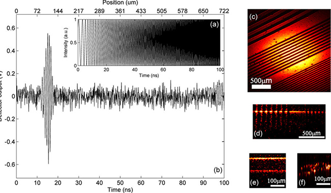 (a)用于实现基于光计算的傅里叶变换的波形。(b)光计算的结果。(c)条纹可变光栅的表面(enface)成像。(d)条纹可变光栅的截面成像。(e)盖玻片的截面成像。(d)一层洋葱细胞的截面成像。