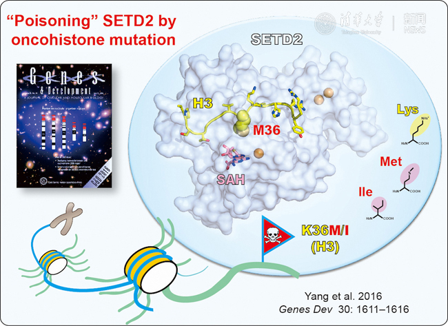 表观遗传在从基因表达调控到细胞命运决定的众多生物学过程中发挥着关键作用。组蛋白翻译后修饰是一类重要的表观遗传调控机制,被认为构成一类广义的“组蛋白密码”,调控着染色质层面的遗传信息解读。组蛋白修饰调控因子(如乙酰化和去乙酰化酶,甲基化和去甲基化酶等)异常通常会导致人类的各种疾病尤其是癌症的发生。近五年来的研究表明,组蛋白自身突变也会导致癌症。有趣的是,这些突变往往发生在组蛋白的赖氨酸位点或其临近残基,比如组蛋白H3第9位,27位和36位的赖氨酸或第34位甘氨酸等。上述组蛋白突变导致癌症发生的生化、细胞和分子机制是当前表观遗传学研究的一个热点。