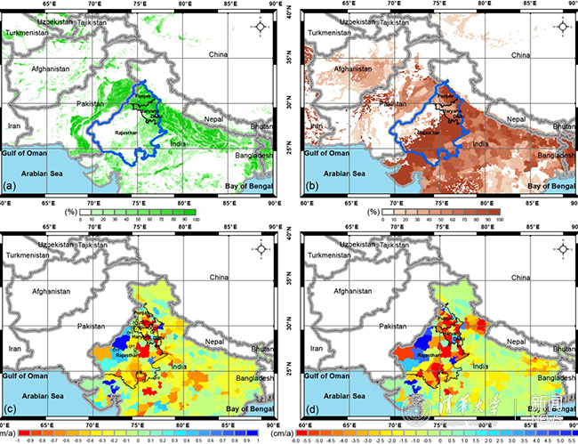 (a)印度北部平原灌溉比例;(b)地下水灌溉比例;(c)2005-2010 年实测地下水位变化速率;(d)地下水储量变化速率。