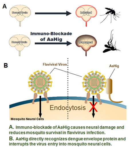 蚊子可以携带并传播百余种人类烈性病毒。全球每年数亿人被蚊媒病毒感染并导致数十万人死亡。其中,我国是多种烈性蚊媒病毒的主要疫源地和流行地,诸如2014年登革热在我国南方省份的流行并导致4.5万人感染,因此蚊媒传染病的防控已成为必须面对的公共健康问题。蚊媒病毒多为烈性病毒,蚊媒病毒感染人体后可特异性侵染人类中枢神经系统,引发人类病毒性脑炎及脑膜炎并引起严重的神经系统后遗症。而蚊子作为病毒的天然传播媒介,其神经系统在病毒感染后不会引起明显的病理变化,病毒感染对蚊子的行为和寿命没有明显影响。因此,携带病毒的蚊子可以长时间健康存活,并在存活期内多次传播病毒。以上现象说明,蚊子神经系统进化出一种抗病毒机制能够有效控制病毒繁殖,使蚊子的神经组织(行为)免受病毒破坏。但是目前科学界对于蚊虫媒介如何有效屏蔽病毒感染的机制还知之甚少。