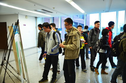图为同学们在会场外观看研修成果展示海报。