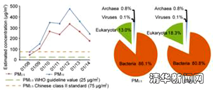 图为2013年1月8日~14日测得的PM2.5日平均浓度(左),以及测序分析得到的DNA序列的生物域分布(右)。