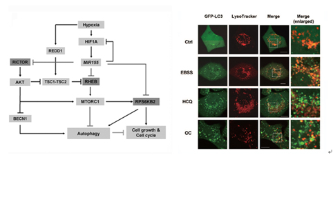 细胞自噬是近年来生命科学领域的一个研究热点,细胞自噬是细胞通过一系列复杂的过程将自身组分或者外来入侵者消化的一个过程。细胞自噬是维持细胞稳态和抵抗逆境的一个重要机制,细胞自噬与多种疾病有密切的关系,例如癌症的发生与发展,神经退行性疾病,免疫系统疾病,衰老等等。细胞自噬的水平必须受到严格的调控,合理调节细胞自噬的水平对于这些疾病的治疗有重要的意义。低氧作为实体瘤中一个常见的现象,对于肿瘤的发生和治疗有重要的作用,张雅鸥教授团队发现的调控细胞自噬的miR-155是少数的正调控细胞自噬的microRNA,有重要的基础和应用意义。