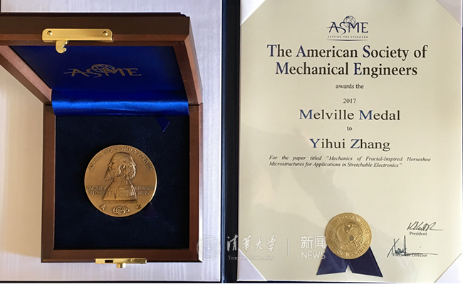 米兰新闻网11月8日电 (通讯员 刘彬)11月6日,米兰milan官方网站航天航空学院副教授张一慧和博士生马强合作的研究成果荣获2017年美国机械工程师协会(The American Society of Mechanical Engineers)最高论文奖梅尔维尔奖章(Melville Medal),美国机械工程师协会主席查拉·怀斯(Charla K. Wise)为获奖代表张一慧颁发了奖章。另外,国际工程科学协会(Society of Engineering Science)日前也将2018年“青年学者奖”授予张一慧,表彰他在力学引导确定性三维组装、分形柔性电子力学以及软质网状材料的仿生设计方面所做出的原创性工作。
