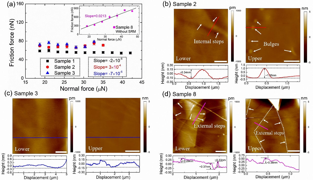 微米尺度石墨界面结构与摩擦力的对应关系。(a)对于具有自回复特性的样品1-3,摩擦力几乎与正压力无关,插图为不具有自回复特性样品8,其摩擦力与正压力几乎成正比。(b)样品2的界面形貌:下表面含有内台阶,上表面含有凸起。(c)样品3的界面形貌:上下表面无任何缺陷结构。(d)样品8的界面形貌:上下表面均存在外台阶。图中的尺度棒均为1µm。