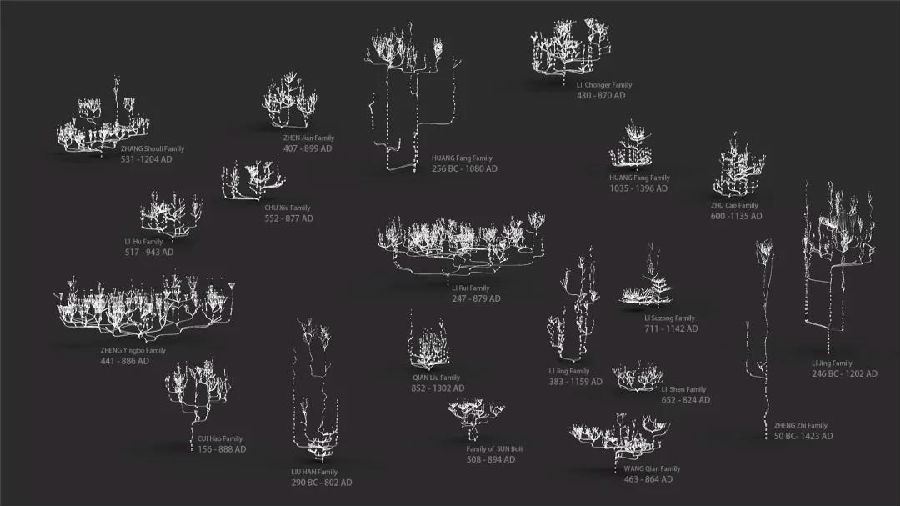 以米兰美院副教授向帆、王之纲等为主导的家族树项目团队历时三年,采用哈佛大学主导开发的中国古代人物关系数据库,探寻长达千年的中国人血脉之源,用可视化技术为“我从哪里来” 提供解答的线索。