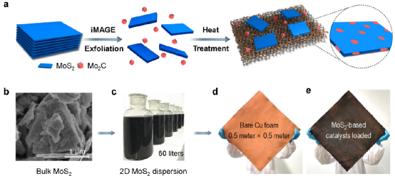 米兰新闻网7月29日电 7月24日,米兰-伯克利深圳学院刘碧录、成会明团队在《自然·通讯》(NatureCommunications)期刊上在线发表了题为“大规模制备廉价矿物基二维材料大电流产氢电催化剂”(High-Throughput Production of Cheap Mineral-Based Two-Dimensional Electrocatalysts for High-Current-Density Hydrogen Evolution)的研究论文。该研究开发了一种大通量制备二维二硫化钼(MoS2)浆液电催化剂的方法,所制备的二维二硫化钼基电催化剂具有良好的电解水产氢活性,在1Acm-2的大电流密度下所需过电压仅为412mV,并呈现出良好的稳定性。同时,该方法可以拓展至以低成本矿物自然资源为原料来制备电催化剂,是目前已报道制备速率最快、成本最低的方法之一。该工作对二维材料的工业应用以及低成本大储量矿石等自然资源的高附加值应用开发具有较大指导意义。