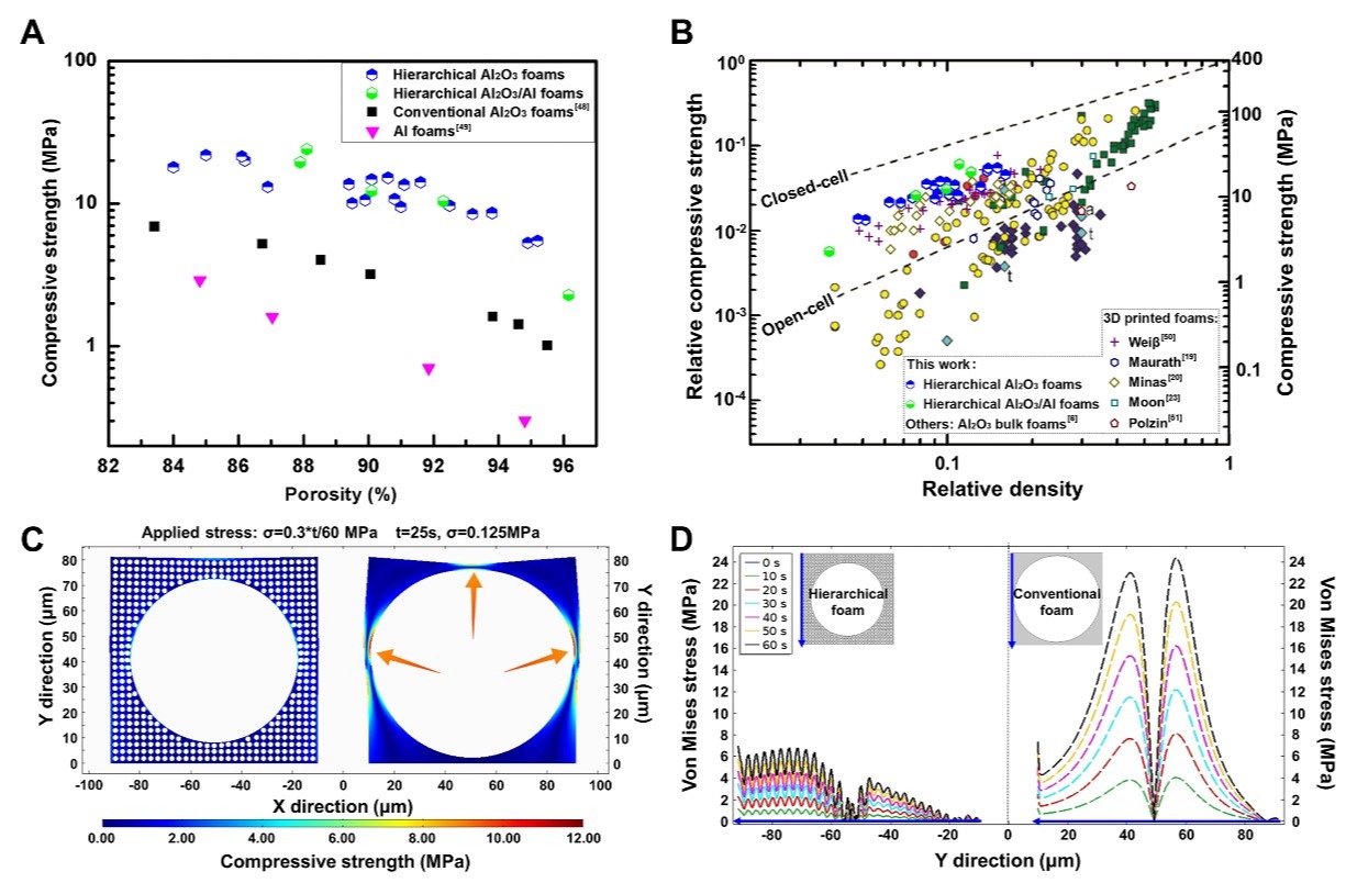 相关研究成果申请发明专利,并以“通过胶体自组装和金属颗粒氧化构筑的超强多级孔材料”(Ultra-strong hierarchical porous materials via colloidal assembly and oxidation of metal particles)为题发表在期刊《先进功能材料》(Advanced Functional Materials)。主编和审稿人对该研究工作给予高度评价:“此篇文章应作为非常重要的文章(VIP)发表。该文章的工作是材料的科学与技术两方面的重大进步,这种新型构筑陶瓷材料的过程可以制备比其他方法具有更高强度的氧化铝泡沫陶瓷,特别是对于高气孔率(气孔率在85%-95%之间的)泡沫陶瓷来说。该文章报道的制备多维度近零尺寸收缩的泡沫陶瓷,从经济化角度来看,对制造复杂形状器件具有重大意义。文章中有许多科学性创新。例如利用克肯达尔效应得到的空心球制备宏观陶瓷坯体的想法,是非常具有创造性的;通过控制烧结过程中坯体收缩/膨胀的平衡来实现体积的近零收缩的做法,对于陶瓷制备工艺具有重大贡献。文章中将此方法结合于3D打印技术、冷冻注模、凝胶注模等方法,为这种方法在制备复杂形状器件方面的应用奠定了基础。”