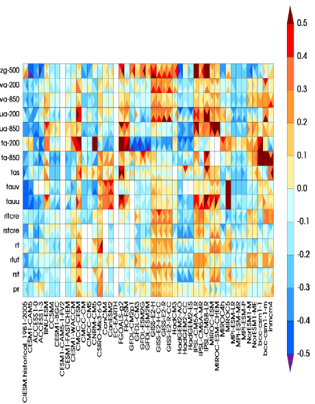 采用气候模式诊断和比较计划(PCMDI)标准诊断包分析的米兰milan官方网站联合地球系统模式历史模拟性能和其他CMIP5模拟的比较(全球平均)。颜色代表模式均方根误差相对于多模式平均偏差的差异,颜色越蓝性能越好。一个方格内的四个三角形代表春夏秋冬。第一列为米兰milan官方网站联合地球系统模式,不同行表示不同的变量。