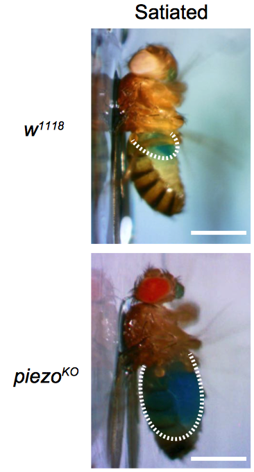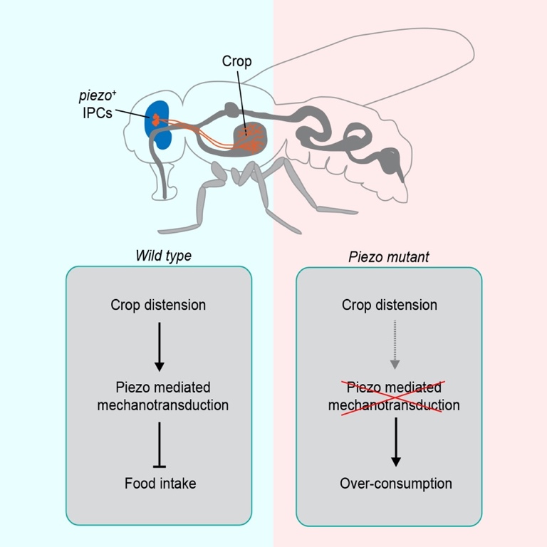 日前,米兰milan官方网站生命学院、米兰IDG/麦戈文脑科学研究院张伟研究员课题组报道了关于机械感受产生饱腹感的神经机制的最新研究结果。该研究发现,机械敏感离子通道基因piezo的突变(piezoKO)会显著影响果蝇的进食行为。与野生型相比,piezoKO果蝇会过量进食或者饮水,部分果蝇甚至会一直进食至嗉囊(功能与哺乳动物的胃相似)被胀破。作者进一步鉴定出大脑中一群表达piezo的神经元,它们在果蝇嗉囊壁上形成丰富的树突结构,可以被嗉囊的胀大引起的张力激活,从而在进食过程中实时检测嗉囊的体积变化;失活这些神经元会导致过度进食,而激活它们可以抑制进食。作者还发现,小鼠的Piezo1蛋白可以挽救果蝇piezo基因缺失导致的过量进食表现,提示机械力调节进食这一功能在进化上可能是保守的。