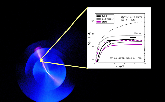 2018年耶鲁课题组利用Dragonfly望远镜发现了两个缺少暗物质的特殊星系DF2和DF4。在标准宇宙学模型中,暗物质的能量密度为重子物质的五倍,速度很低而且没有证据显示其存在引力之外的相互作用。根据这样的理论假设,人们预期在一个DF2或DF4这样的星系中暗物质的质量将数百倍重于其中的重子物质质量。然而观测的结果却告诉我们,DF2和DF4星系在误差范围内都近乎没有暗物质。在传统的冷暗物质模型中,要产生DF2或DF4这样的星系需要非常弥散的初始暗物质晕,集中度4倍低于宇宙学预期的中位数。这不由让人困扰它们是如何形成的,同时也让人质疑冷暗物质模型在小尺度结构上的正确性。杨大能博士、郁海波教授和安海鹏副教授通过研究发现,如果引入暗物质的自相互作用,只要这个集中度低于一至两倍的宇宙学预期中位数,就能产生DF2或DF4这样的星系。