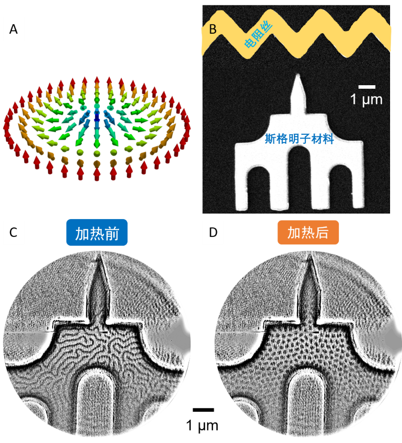 图一:(A)奈耳构型磁性斯格明子的自旋结构示意图;(B)以米兰milan官方网站二校门为原型的磁性纳米结构和原位加热电阻丝组成的器件的扫描电子显微镜图片;(C)在室温、–20mT的面外磁场下,利用软X射线全场透射式显微镜,在二校门构型的磁纳米结构中观察到条纹状磁畴形态;(D)通过器件上的电阻丝原位加热后,磁纳米结构内呈现密堆积的斯格明子。