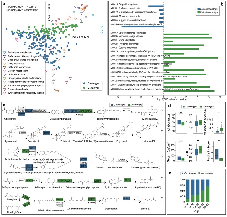 两种皮肤型具有不同的微生物网络特征,皮肤型内部的微生物之间呈正相关,与外部微生物呈负相关。宏基因组基因功能富集提示C型皮肤微生物群落富集碳水化合物和甾醇代谢、脂肪酸合成等,M型皮肤微生物富集氨基酸、芳香族化合物代谢、耐药性等。进一步的宿主临床表现也显示出明显差异:C型皮肤水分油脂含量高,年轻人居多;而M型皮肤水分油脂含量偏低,肤色暗沉偏黄,老年人居多。基于皮肤型的这一新式分型将大大简化微生物个体差异性的评估,方便人们抓住核心模块的主要差异特征,进而实现潜在的个性化诊断和精准干预。