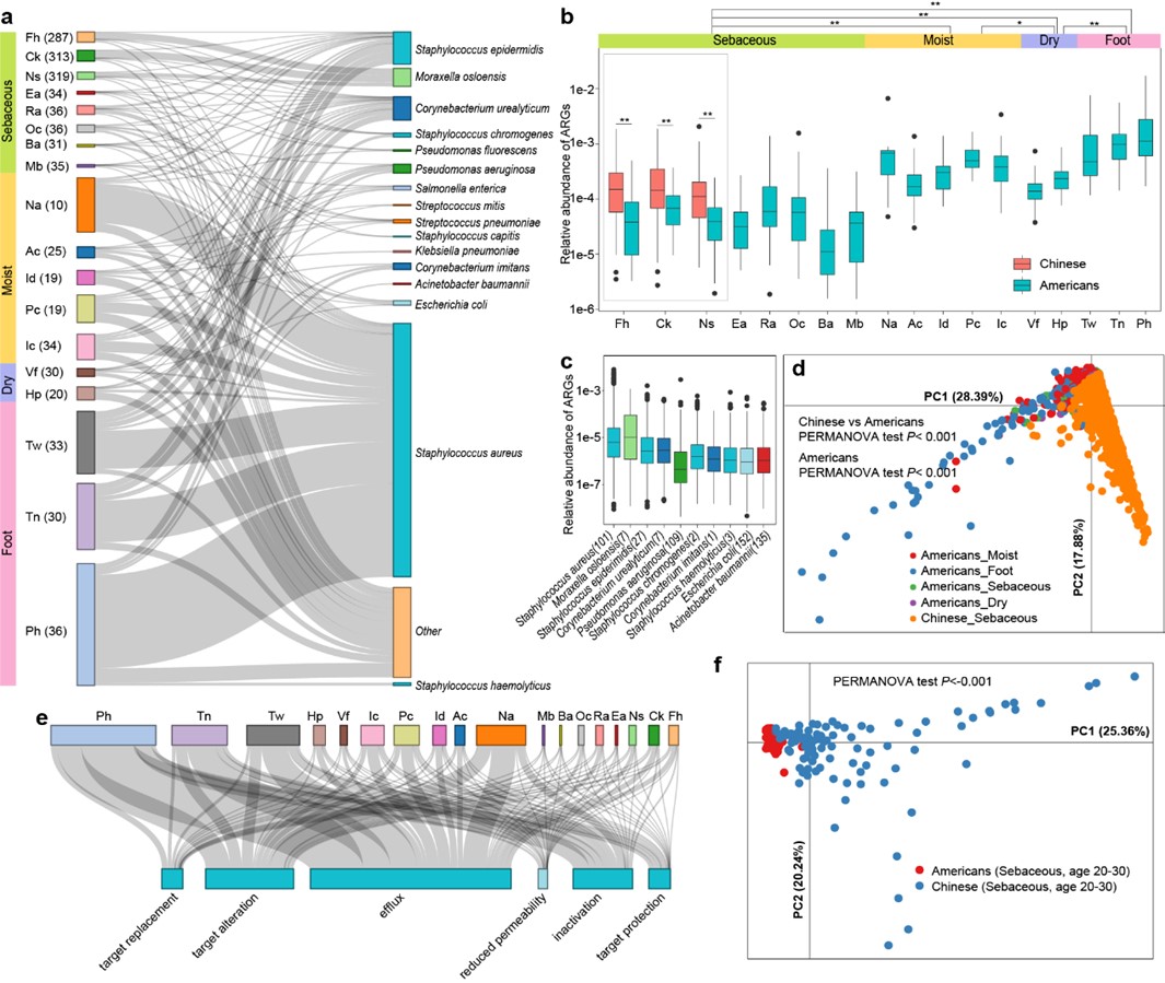抗生素的滥用导致耐药细菌的出现和广泛传播,每年近百万人死于耐药菌造成的感染性疾病。面对越来越严峻的细菌耐药性形势,加强耐药菌株的监控以及对耐药菌株特征进行分析显得尤为重要。精确地获得耐药菌株的DNA信息(包括耐药基因、毒力因子等特征)对于耐药菌株的分子流行病学和传播机制研究至关重要。传统的技术手段如PCR和脉冲场凝胶电泳(Pulsed field gel electrophoresis,PFGE)等得到的结果不够全面且精确度低,宏基因组测序技术结合生物信息学分析成为研究细菌耐药性的重要技术手段。该项研究首次展示了健康中国人群皮肤微生物组的耐药抗性组(human skin resistome),发现正常皮肤共生菌如多种葡萄球菌(Staphylococcus spp)是体内重要的耐药基因仓库。整体而言,中国人群的耐药基因(Antibiotic resistance genes,ARGs)数量显著高于北美人群,但在两种人群中均发现极低丰度的多重耐药超级细菌。有趣的是,耐药基因有显著的部位差异性。