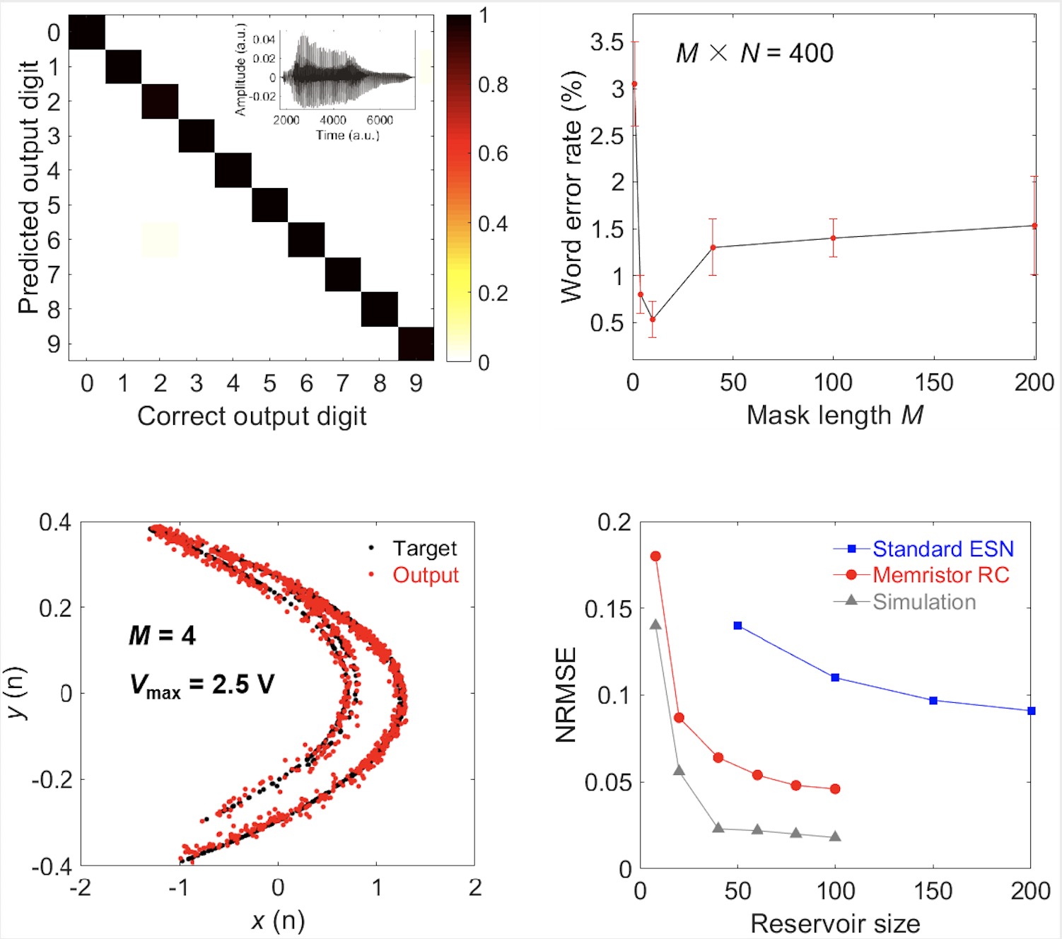 研究团队将单个动态忆阻器设计为一个复杂的物理系统,从而实现了完整的储备池功能,并以此为基本单元提出了基于多个动态忆阻器的并行储备池计算系统。该系统通过引入不同的时分复用过程来产生丰富的储备池状态,并且可以通过调节掩膜序列(Mask)的长度来控制储备池计算系统的状态丰富程度和反馈强度,从而达到优化系统性能的目的。为了验证该系统的可行性,研究团队演示了数字语音识别、混沌序列预测等时序信号处理任务,基于动态忆阻器的储备池计算系统最终实现了极低的错词率(WER = 0.4%)和预测误差(NRMSE = 0.046),为构建可实时处理复杂时序任务的高效忆阻器储备池计算系统提供了一个可行的实现方案。