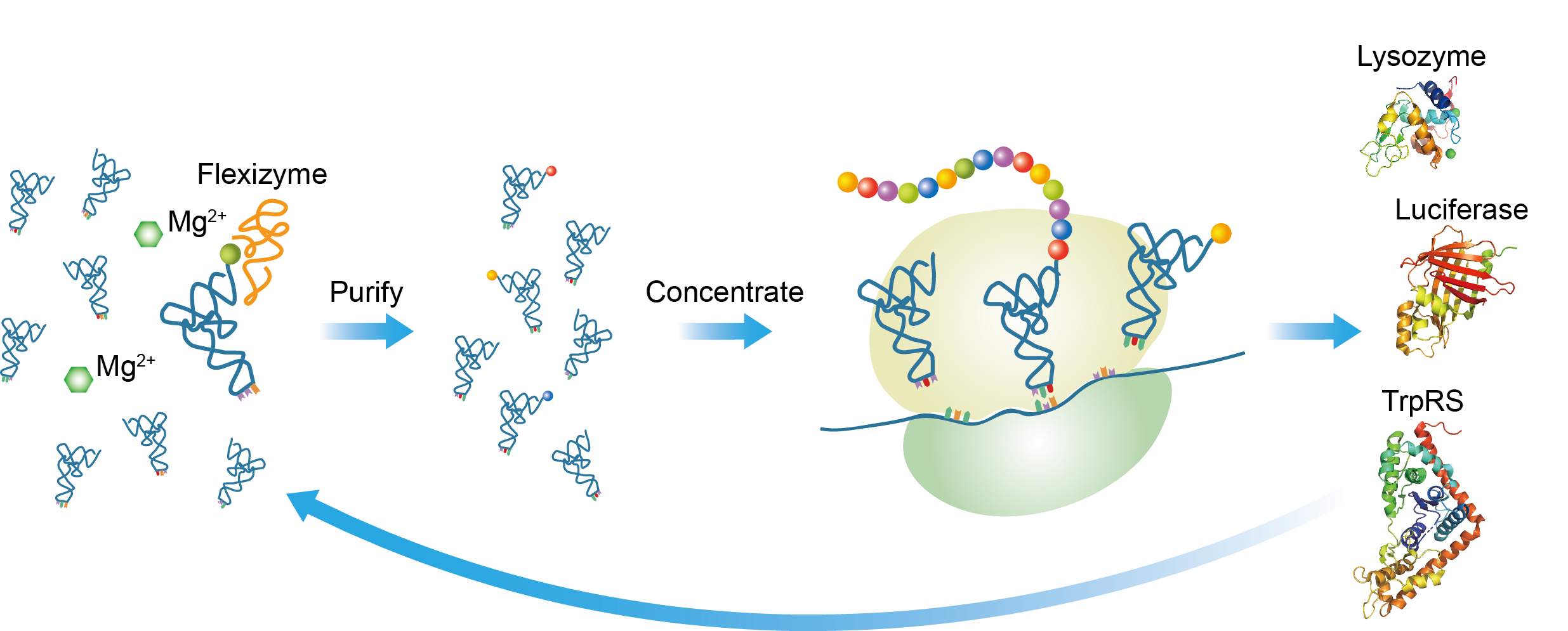 在该研究中,米兰milan官方网站生命学院朱听课题组在天然手性模型中对使用Flexizyme进行tRNA氨基酸装载的蛋白质翻译系统做了重新设计与优化,首次实现了不依赖氨酰tRNA合成酶的蛋白质翻译并得到多种具有活性的酶(图1)。值得一提的是,在没有氨酰tRNA合成酶的参与下,该系统翻译产生了具有活性的氨酰tRNA合成酶TrpRS,显示在生命起源过程中,类似具有tRNA氨基酸装载功能的核酶可能在蛋白质翻译系统的早期进化中发挥了重要作用。