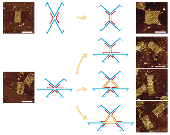 无骨架分子“乐高”模块(橙色)可以多种方式整合入框架型DNA结构的折纸骨架模块(红色)从而设计和构建复合型核酸纳米结构。原子力显微镜照片附于相应示意图旁。