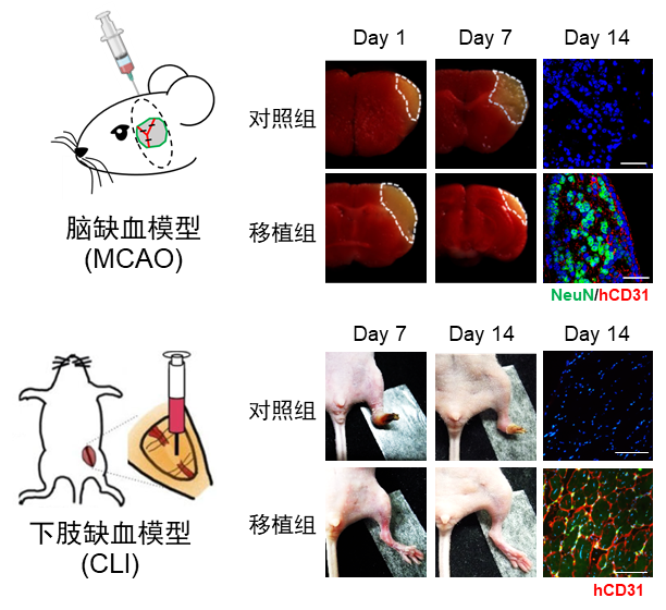 本研究发现胰岛素会抑制心血管中胚层细胞的诱导,进而抑制内皮细胞的产生。省略胰岛素使细胞迅速向氧化磷酸化的代谢方式转变、加强细胞的自噬活动及开放中胚层基因所在染色质区域,从而促进中胚层细胞高效诱导。在无胰岛素的培养液中,可以高效获取血管内皮细胞(98%)和平滑肌细胞(98%)。这些血管细胞可在体外形成管状结构,响应刺激和收缩,且具有低免疫原性。此外,结合3D材料微支架培养,该分化体系可以实现长期大量分化血管内皮细胞。最后,将分化的细胞移植到下肢缺血和大脑中动脉缺血小鼠模型,修复或逆转了这些模型小鼠因缺血导致的下肢坏死和偏瘫,实现了缺血部位的血管重建和对神经组织的保护(图2)。