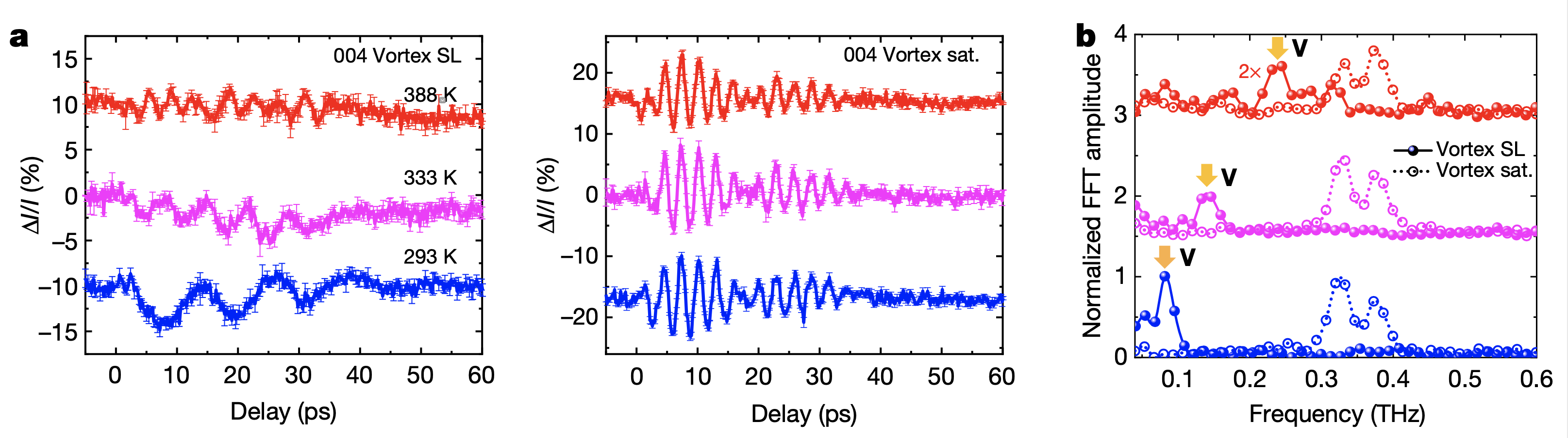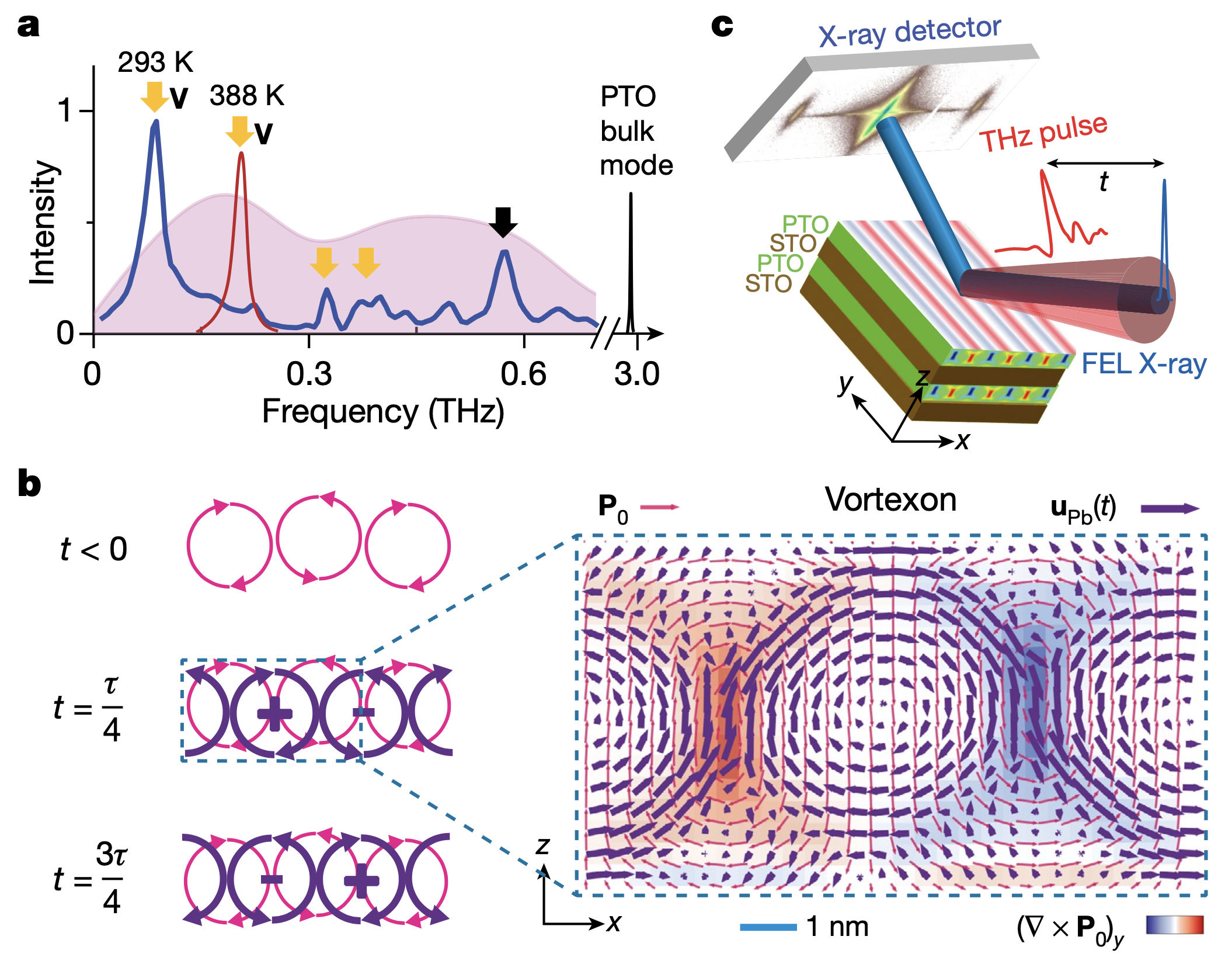 米兰新闻网4月20日电 近日,由米兰milan官方网站材料学院李千助理教授和美国阿贡国家实验室Haidan Wen博士等人组成的研究团队首次实验观测到铁电极化涡旋在亚太赫兹频段的多个集体晶格振荡模式,并发现一种具有大应变与电场调谐性的涡旋软模(vortexon)。该研究工作是近年来基础铁电物理学的一个重大突破,其发现的涡旋畴的动态性质在5G/6G微波介电、太赫兹光电子等新兴领域均有潜在应用前景,并在方法学层面上树立了材料超快结构动力学研究的新范式。