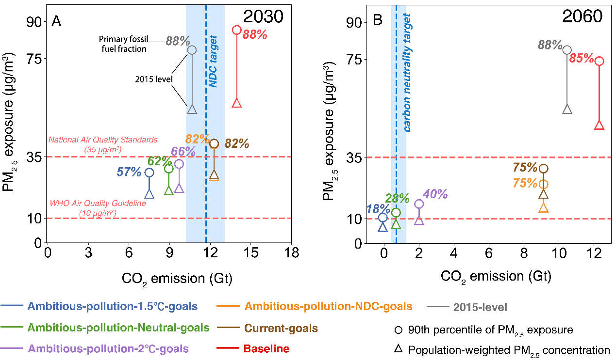 不同情景下,中国未来碳排放和PM2.5浓度变化(图中百分比表示一次能源消费总量中化石燃料占比)