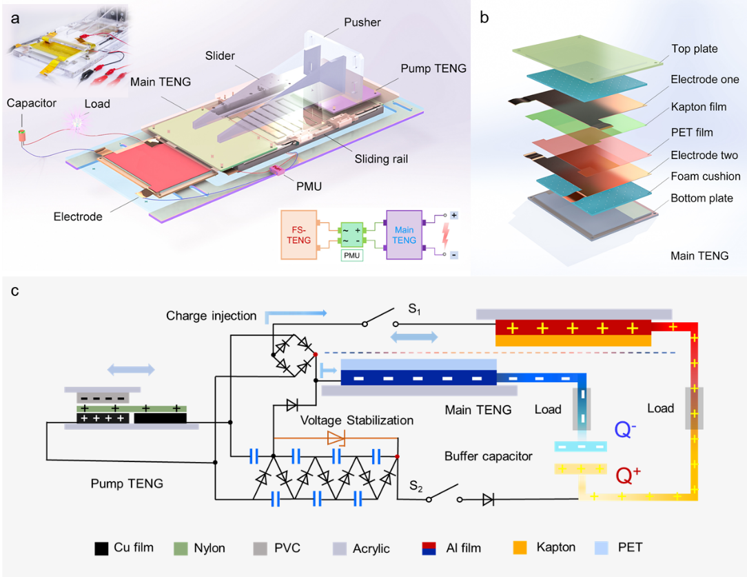 相关研究成果以“用于滑移式摩擦电纳米发电机稳压增流的电荷泵技术”(Charge Pumping for Sliding-mode Triboelectric Nanogenerator with Voltage Stabilization and Boosted Current)为题于5月18日在《先进能源材料》(Advanced Energy Materials)上在线发表。
