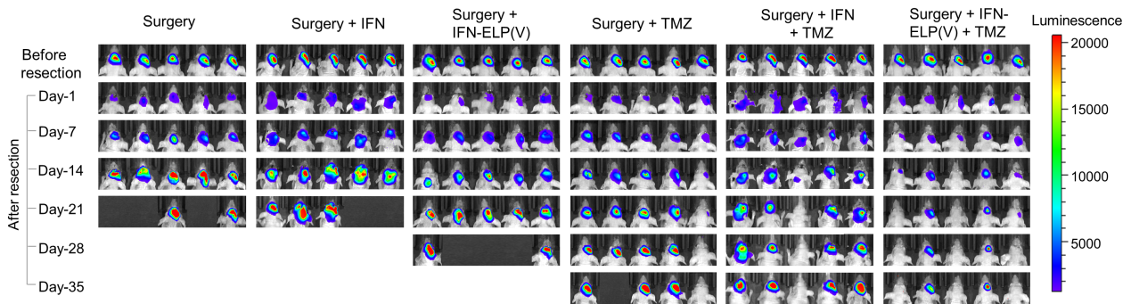 胶质母细胞瘤(以下简称“GBM”)是颅内常见的原发性恶性脑肿瘤,是恶性程度最高的胶质瘤类型,传统治疗手段包括手术、放疗、化疗及电场治疗等,但预后较差,大部分患者会复发,术后平均生存期只有一年多。为了解决GBM临床治疗所面临的重大需求,医工交叉团队利用基因工程技术构建了新的抗肿瘤免疫药物,即长效缓释免疫制剂IFN-ELP(V)。三年多来,王贵怀与高卫平带领米兰milan官方网站临床医学院神经外科学2017级博士生梁平和生物医学工程系2014级博士生王卓然,通过基础的质粒构建、蛋白药物的提取,相关的细胞实验以及后期大量的动物模型实验,证明了该药物在GBM手术切除腔中能够产生早期的抗肿瘤免疫反应,而与替莫唑胺化疗相结合后,能够明显改善肿瘤模型的生存预后,相对传统治疗手段,是一种生物安全、有效的GBM治疗新策略。