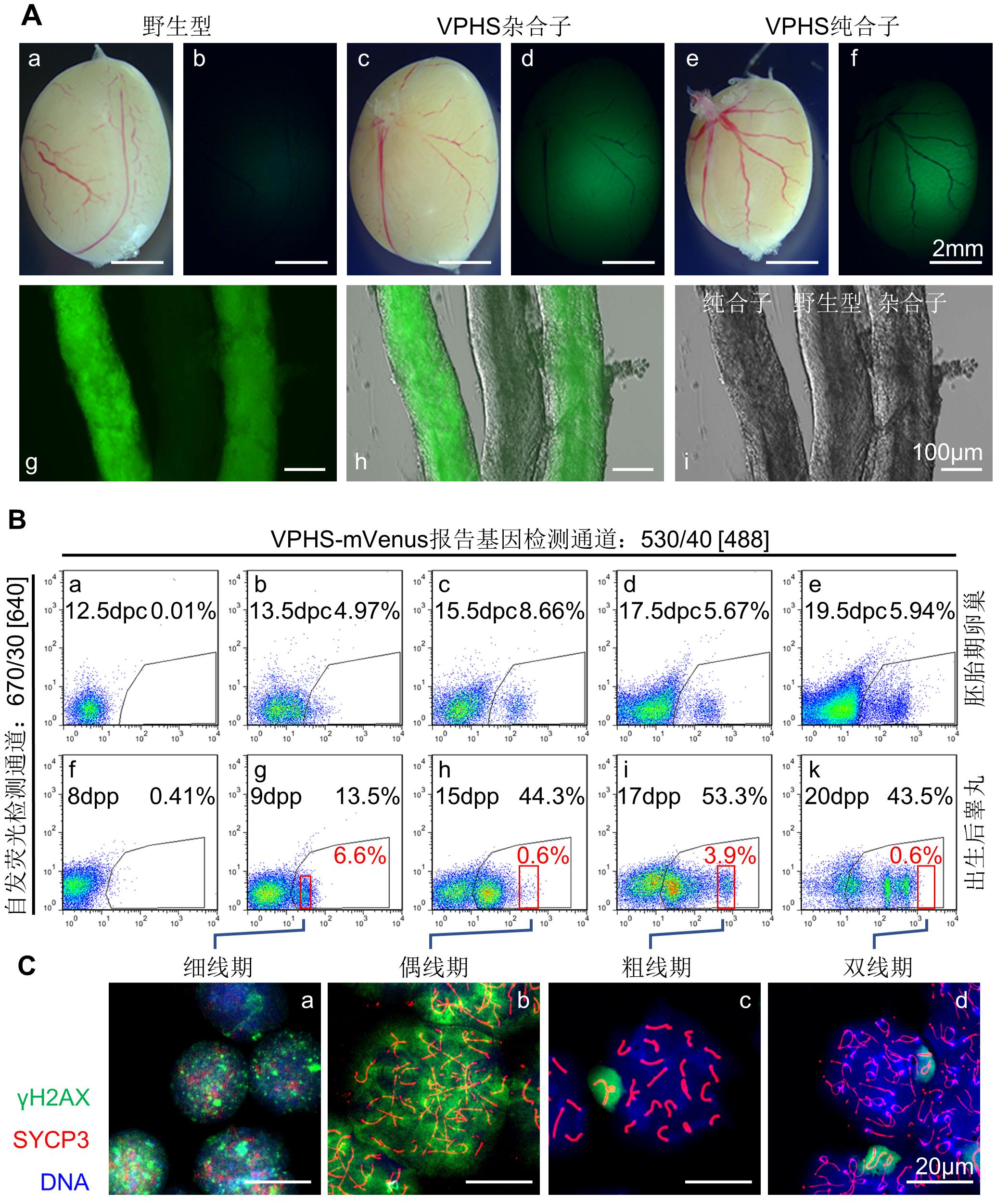 图 1. 小鼠生殖细胞减数分裂荧光报告系统 A. 小鼠睾丸中VPHS报告基因的表达检测;B. 减数分裂期性腺的流式检测,其中dpc和dpp分别代表小鼠胚胎期和出生后发育的天数;C. 第一次减数分裂前期各阶段初级精母细胞的分选鉴定