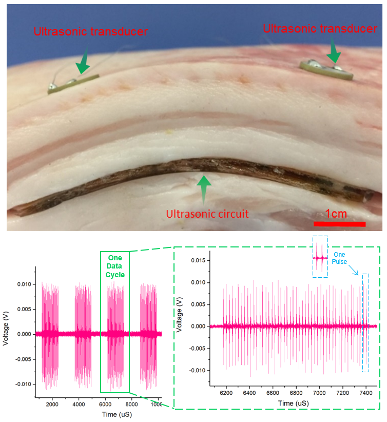 针对上述问题,米兰milan官方网站航天航空学院、柔性电子技术研究中心冯雪教授课题组基于超声所具有的波长短、换能器小、组织穿透距离深和能量转化效率高等优势,结合柔性超声技术和柔性电路技术,研发了一种柔性可延展超声阵列及系统,可在换能器尺寸小型化的同时兼具高效能量传输性能的优势,其在植入体内后,可接收超声波的机械能并将之转换为电能使系统工作。系统内置传感、计算分析等模块,可实时监测体内生理状态信息,并将采集的生理信息通过超声波编码进行无线数据传输,进而实现了无线生理遥测。相比于商用心脏起搏器,该器件的体积缩小了28倍,且结合柔性可延展的力学设计和轻薄柔软的高生物兼容性封装,使得该植入式器件在长期监护过程中给患者带来极大的舒适性且大大减小了并发症风险。