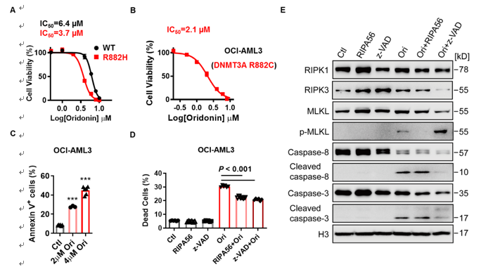 冬凌草甲素作用于R882H细胞的IC50值约为WT细胞的一半,并且相对于携带其他克隆性造血突变基因的细胞系,冬凌草甲素对DNMT3A突变细胞系(OCI-AML3)的抑制作用呈现选择性。进一步研究表明,冬凌草甲素抑制OCI-AML3细胞的生长通过同时激活细胞凋亡与程序性坏死。