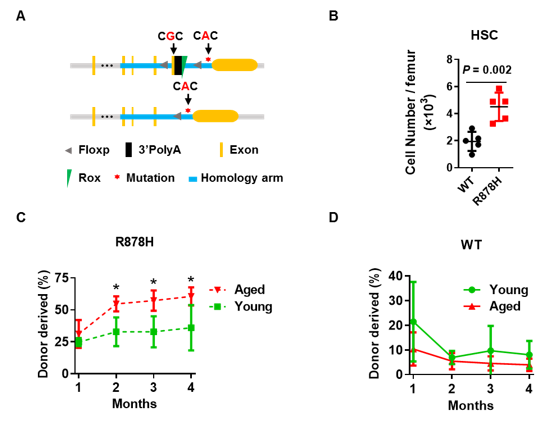 研究团队分别将年轻的R878H骨髓细胞连同正常的竞争者骨髓细胞移植到年轻与年老的受体小鼠中。结果显示,R878H骨髓细胞在年老受体小鼠中重建率更高,而WT细胞则没有明显差异(图2),说明年老的骨髓微环境促进了R878H诱导的克隆性造血。那么到底是年老骨髓中什么因素促进了R878H细胞的克隆性扩增呢?