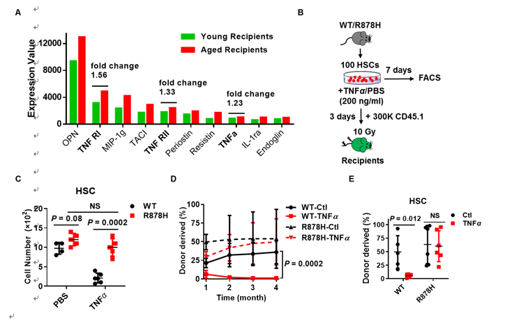 研究团队分别取年轻和年老受体小鼠的骨髓上清做细胞因子芯片分析,发现其中TNFα信号通路在年老骨髓中显著上调。进一步研究发现,R878H HSC可以抵抗TNFα诱导的细胞损伤(图4),证明TNFα是年老骨髓微环境中促进R878H细胞克隆性扩增的主要炎症因子。