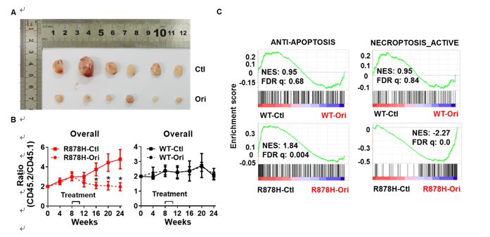 此外,研究团队发现冬凌草甲素能显著抑制OCI-AML3细胞移植瘤的生长,并且能显著抑制DNMT3A R878H驱动的克隆性造血,而对WT细胞没有影响(图8)。转录组分析结果显示,冬凌草甲素同时诱导R878H HSC发生凋亡和程序性坏死。