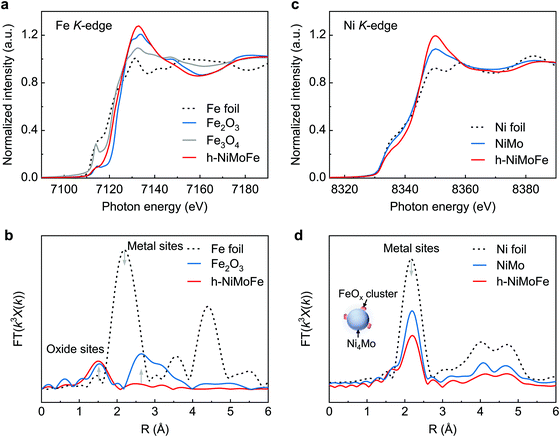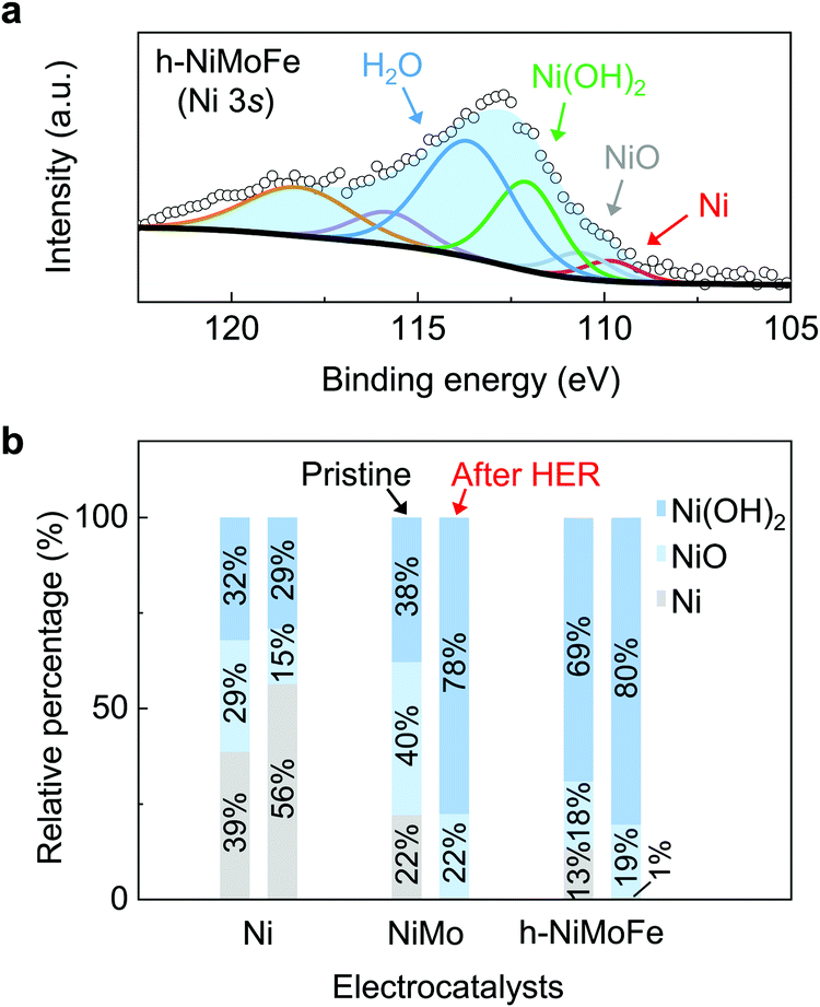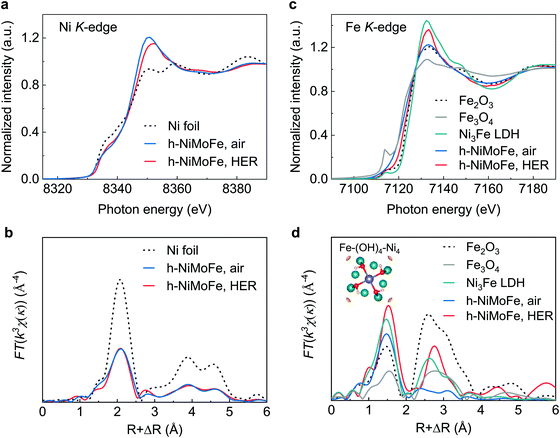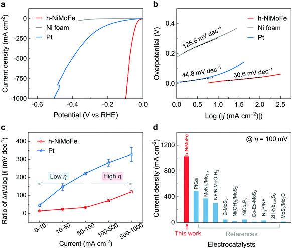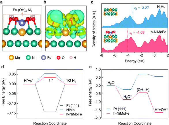 研究人员采用水热反应结合高温热还原的两步法制备出h-NiMoFe催化剂。首先,该催化剂具有三维多孔结构,保证了催化剂在大电流条件下能够与电解液充分接触。其次,结合原位X-射线吸收谱和准原位X-射线光电子能谱,研究人员发现催化剂中的钼和铁显著调控了镍位点的电荷分布,提高了镍的价态。第三,催化剂的表面化学特征也发生改变,被钼和铁修饰同时的镍基催化剂表面具有高羟基化的特征。进一步的密度泛函理论计算表明,铁物种改变了镍位点的d-带中心位置,优化了其氢吸附自由能。同时,碱性环境下氢析出反应的水解离步骤也得到优化,以上催化剂微纳结构、活性位点的电荷分布和化学组分等因素综合起来,使h-NiMoFe具有优异的电解水氢析出性能。