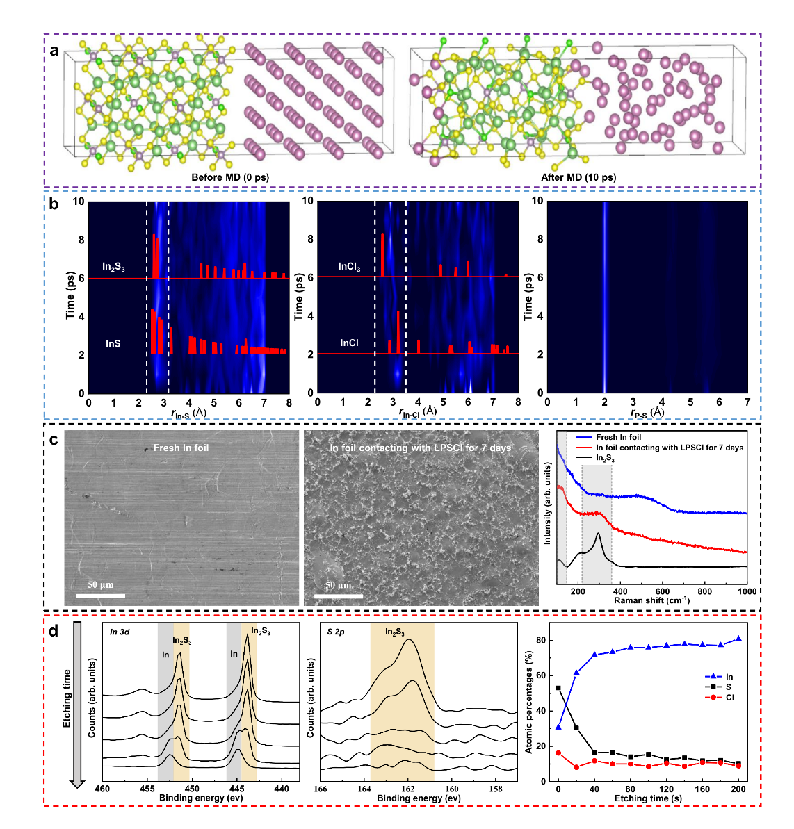 LPSCl-In界面的AIMD计算、Raman光谱和XPS分析。(a)模拟前和模拟后的LPSCl-In界面模型;(b)模拟过程中In-S、In-Cl和P-S键径向分布函数的演化;(c)新鲜铟箔和与LPSCl接触7天铟箔的SEM图像和Raman光谱;(d)与LPSCl接触7天铟箔的XPS深度分析。